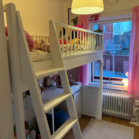 Sängen är monterad som dubbelsäng men går att ändra till loftsäng. Lätt att bygga om.