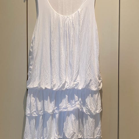 Klänningen är vit och axelbandslös med draperad överdel och figurnära passform upptill. Den har dragkedja bak för stängning. Stygnet har gått upp. Inte så synligt. Därav billigare pris. Pris: 300:-