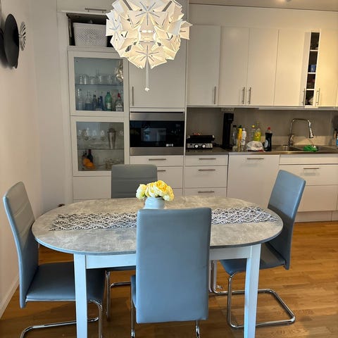 Säljer vårt fina och ganska ovanliga runda Piet Hein matbord. Vit skiva med stålkant och stålben.
