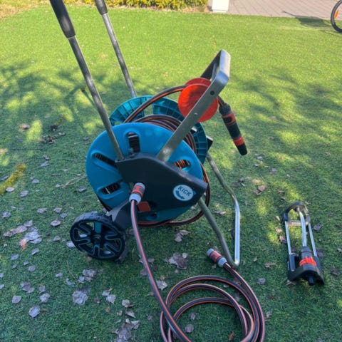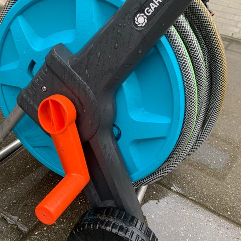 Gardena Kick slangvagn med tillhörande slang och flera bevattningsmunstycken. Slangvagnen har hjul och handtag för enkel förflyttning i trädgården. Slangen är monterad på trumman och ansluts via snabbkopplingar. Flera olika munstycken ingår för varierad bevattning av trädgård, gräsmatta eller rabatter.