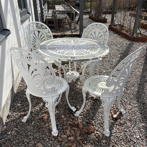Trädgårdsgrupp runt bord och 4 stolar vit metall