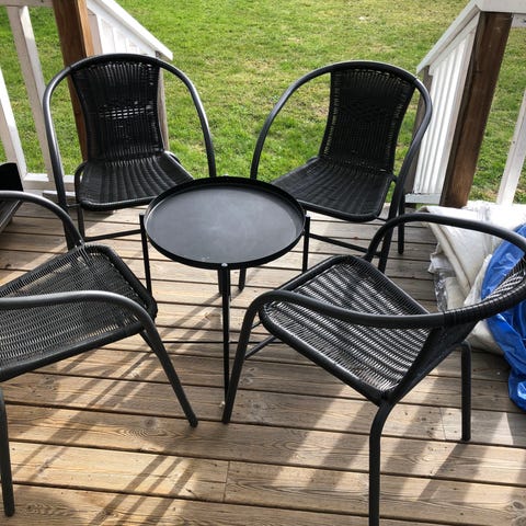 Cafégrupp bestående av ett rektangulärt bord och fyra stolar. Bordsskiva och sitsar/ryggstöd i vitlackerad trä. Underrede och ben är i metall med enkel, klassisk design. Passar bra för uteplats, balkong eller trädgård.