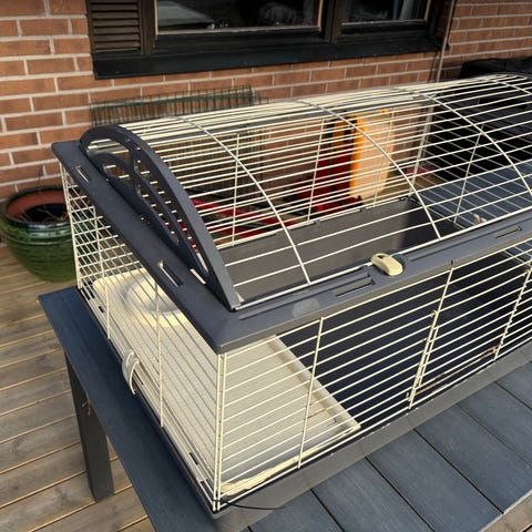 Mycket praktiskt utformad smådjursbur i ok skick, med tillbehör.