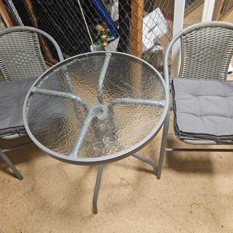 Två stolar konstrotting och bord med glasskiva. Ljusgrå.