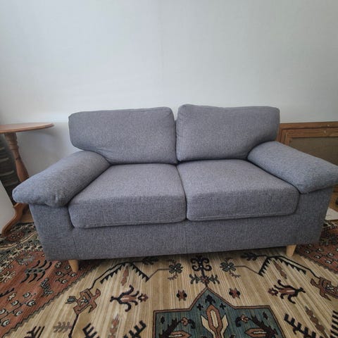 2-sits soffa med teddyklädsel. Sittdyna och rygg i skum. Ben i massivt trä. B137 x H78 x D76 cm