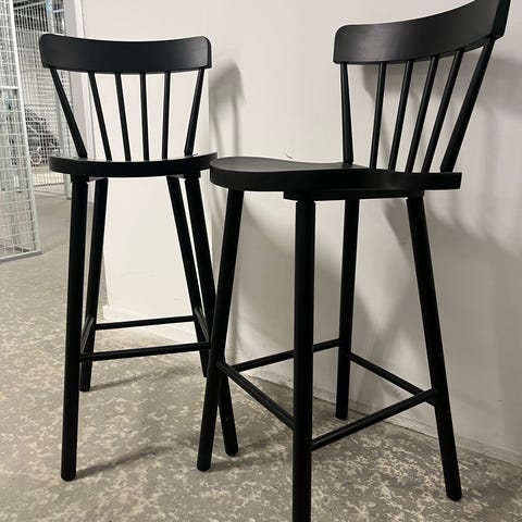 Två stabila svarta barstolar i trä. Höjd: 74 cm