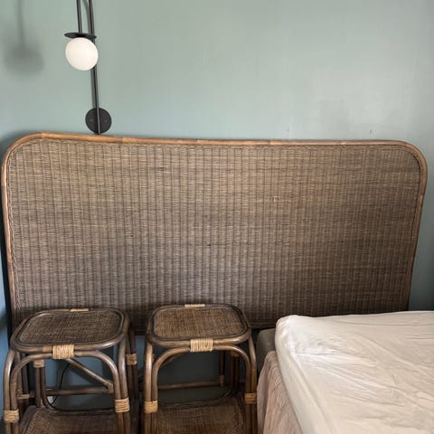 Ca 7 år gammal. Fint skick och mycket stabil. Passar 180‑säng.