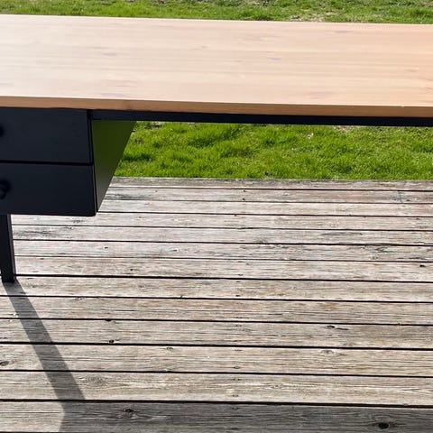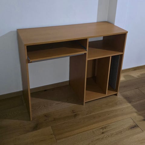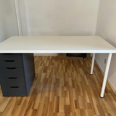 Mindre skrivbord i ok skick. Finns några skador på skrivborsskivan och stol men i övrigt fräscht.