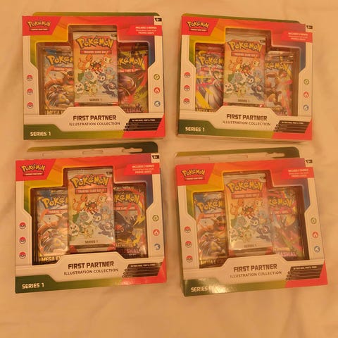 Pokémon First Partner Illustration Collection samlarbox med flera boosterpaket och illustrationer. Produkten innehåller samlarkort och tillbehör för Pokémon Trading Card Game. Lämplig för samlare och spelare som vill utöka sin kortsamling.