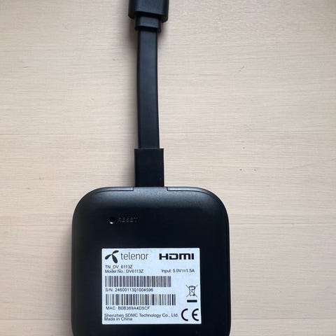 Google Chromecast mediaspelare i svart färg. Enheten ansluts via HDMI till TV eller skärm och använder trådlöst nätverk för att strömma innehåll från kompatibla enheter. Stöd för upp till 1920x1080 upplösning enligt produktspecifikationerna på bilden. Levereras med kort HDMI-förlängningskabel enligt bilderna.