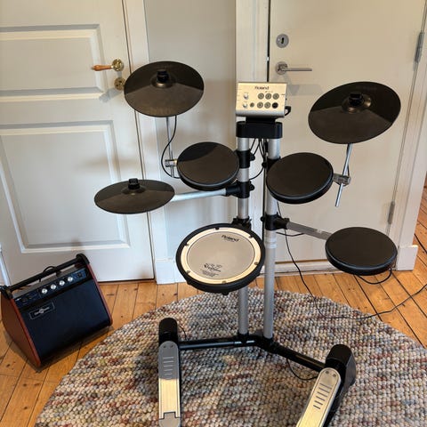 Roland V-Drums elektroniskt trumset i svart. Setet består av flera cymbalpads, virvel- och pukpads, hi-hat-kontroll samt bastrumpedal. Trummodulen har inbyggda ljud och kontroller för volym, ljudval och inställningar. Medföljande stativ håller alla pads och modulen samlade i ett kompakt format. Passar för övning och spel i hemmamiljö där ljudnivån behöver hållas nere.