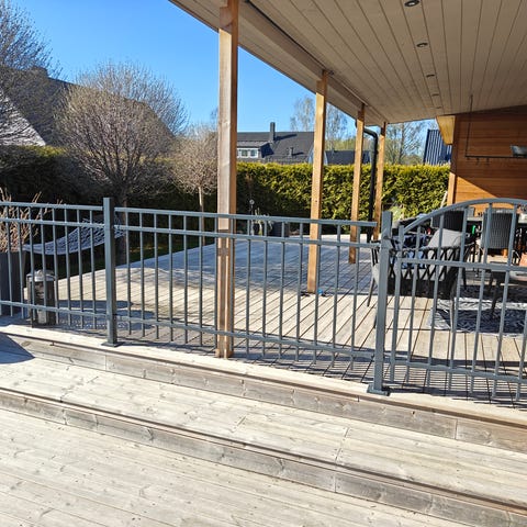 Trä staketsektioner med tillhörande stolpar. Sektionerna består av vertikala brädor nedtill och kryssmönster upptill. Passar som avskärmning i trädgård, på altan eller uteplats. Levereras med metallfötter på vissa stolpar för montering mot fast underlag.