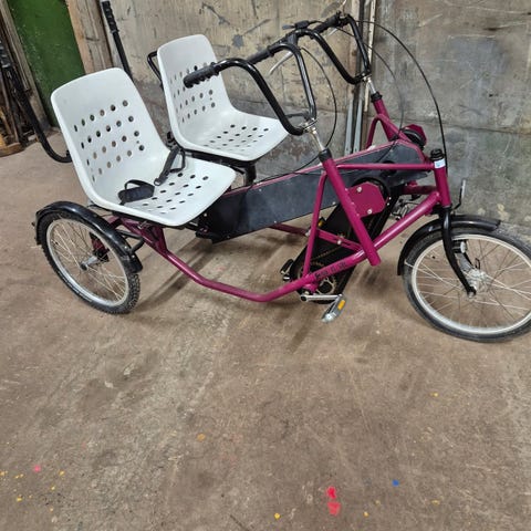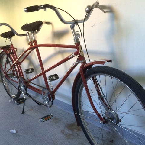 Gammal tandemcykel som funkar om du är händig och gillar att fixa iordning gamla saker. Nya däck och slangar.