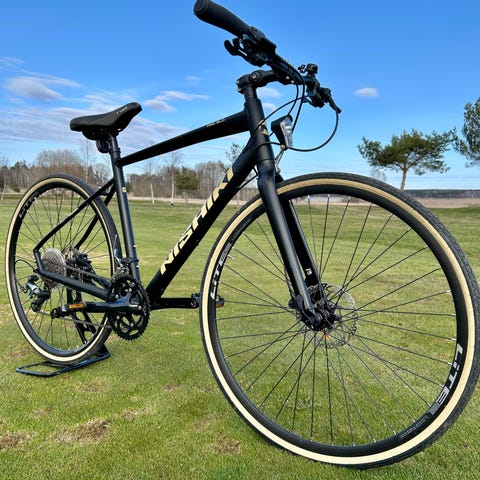 Nishiki race hybrid med ramstorlek M och 28" hjul. Cykeln har skivbromsar fram och bak samt 21 växlar. Smala däck och lätt ram gör den lämplig för pendling och vardagskörning på väg och cykelbana. Ena pedalen har fått sig en smäll, det påverkar ingen funktion utan gör att den bara är något sne.