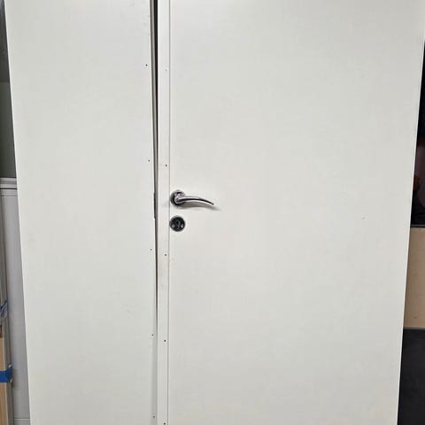 Swedoor Jeld-Wen innerdörr i vit färg. Dörrbladet är slätt med förborrade hål för handtag och lås. Passar som innerdörr i bostad, förråd eller liknande utrymmen. På bilderna syns kant och låskista samt mindre slitage/skador på hörn som kan vara bra att beakta vid montering eller eventuell målning/lagning.