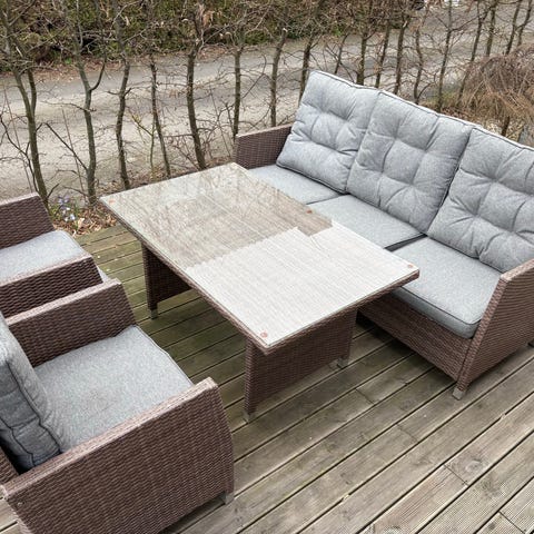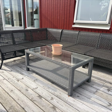 Utemöbler i konstrotting med tillhörande bord. Gruppen består av soffa i två delar med sits- och ryggdynor i grått tyg samt bord med rektangulär bordsskiva med glasskiva. Till gruppen hör även matchande pallar. Passar för uteplats, altan eller balkong där man vill ha sittplatser och bord i ett sammanhängande set.