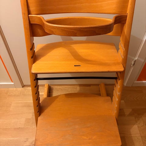 Stokke tripp trapp barnstol i natur färg och i begagnad skick säljes.