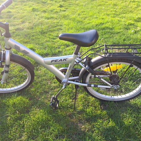 Fullt fungerande barncykel med hand- och fotbroms. 3 växlar. Pakethållare och korg. Lampor, reflexer och ringklocka.