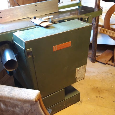 Bandsåg lämplig för träarbeten. Maskinen står på golvstativ och har ett stabilt bord med anhåll för raka snitt. Sågen drivs med elmotor och har skyddskåpa runt bandet. 220v.