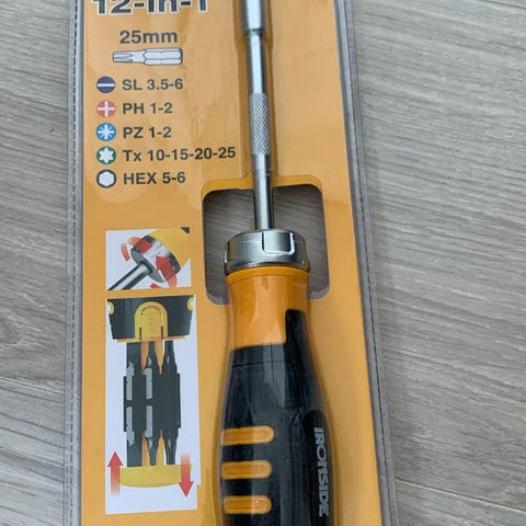 Plastkassett med bältesclips innehållande 29 delar. Minispärrnyckel för bits och hylsor, magnetisk bitshållare, 1/4"x5/16" adapter, 6 st 1/4"-hylsor 6, 7, 8, 10, 12, 13 mm. 20 st 25 mm långa bits av legerat specialstål: Raka spår 3, 4, 5.