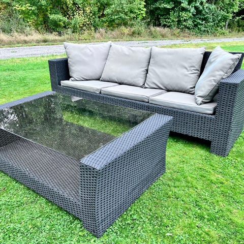Hörngrupp utemöbler konstrotting grå med soffbord glas