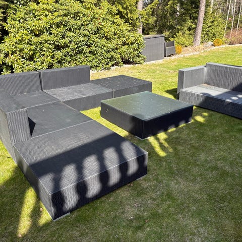 Hörngrupp utemöbler i grå konstrotting, utan dynor, med tillhörande soffbord med glasskiva, samt sittpuff/bord. Märke Brafab. Sittgruppen har ett gäng år på nacken, glasbordet inköpt förra säsongen.