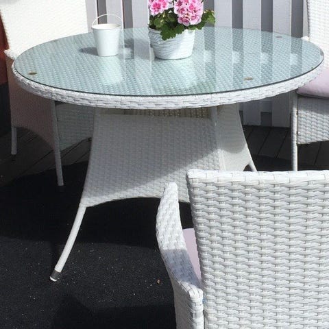 Utemöbelset bestående av ett runt bord och fyra stolar i vit/ljusgrå konstrotting. Bordet har glasskiva och är anpassat för utomhusbruk, exempelvis altan eller uteplats. Bordets diameter är 90cm. Stolarna har armstöd och är utformade för att ge stabil sittkomfort. Materialet är konstrotting som är avsett för att tåla väderpåverkan vid användning utomhus. Säljes pga flytt.