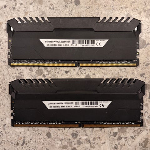 Säljer ett kit med Corsair Vengeance LPX RAM-minnen i fint begagnat skick. Har suttit i en stationär speldator och fungerat felfritt.