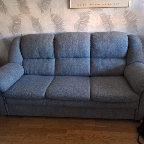 Mio soffa 3-sits i grått tyg. Soffan har hög rygg med tre separata ryggdynor och sitsar.