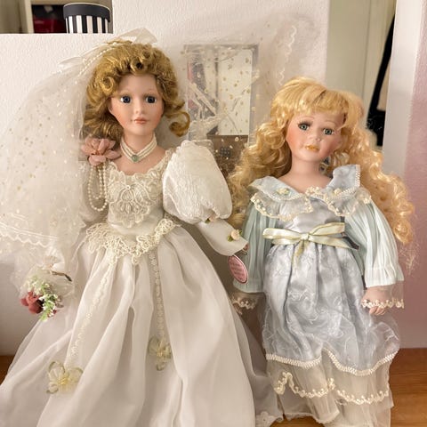 Båda dockorna har matchande överdelar och nederdelar samt huvudbonader i liknande stil.
