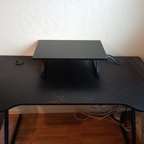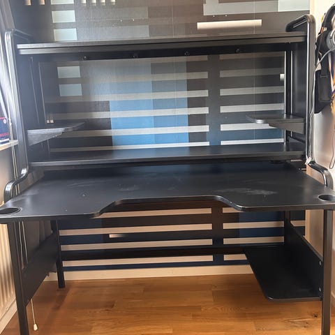 Gamingbord med hyllor. Ett hyllplan har vi monterat ned så det syns inte på bild, men det medföljer i köpet.