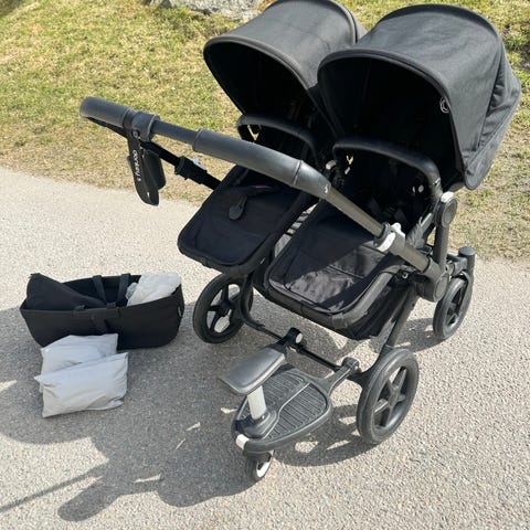 Bugaboo Donkey 3 syskonvagn i svart utförande. Vagnen har två sittdelar som kan monteras på chassit, med ställbart handtag och fempunktssele. Rymlig varukorg under vagnen. Passar för två barn och kan användas som syskon- eller tvillingvagn. Många tillbehör finns. Mugghållare, dubbla extra väskor, ny extra suflett, regnskydd mm.