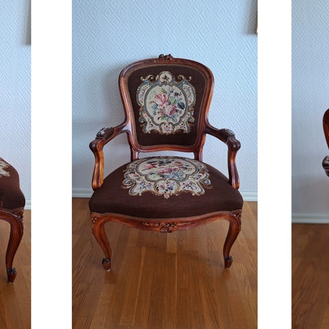 Fåtölj i trä med stoppad sits, rygg och armstöd