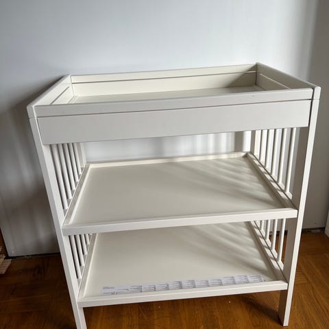 Bra och mycket stabilt skötbord med höga kanter och god förvaring. Vitmålad. Fint skick med smårepor efter normal användning.