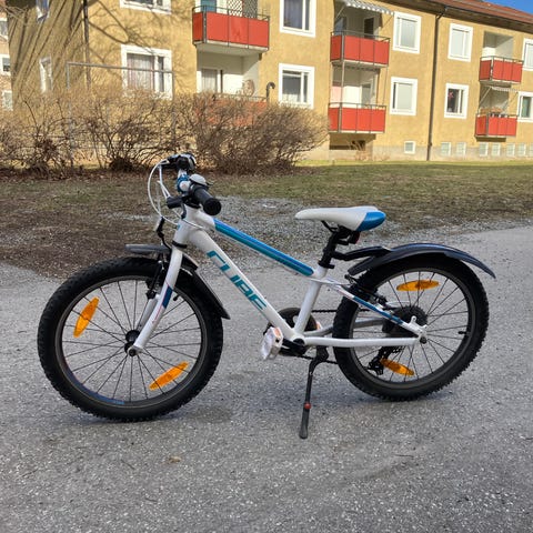 Scott Ghost 2.0 barncykel med 20" hjul. Cykeln har vit ram med dekaler, rakt styre och handbromsar fram och bak. Utrustad med framgaffel med fjädring, stänkskärm bak, reflexer och standardpedaler. Lämplig som barncykel för vardagscykling och fritidsbruk på både asfalt och enklare grusvägar.