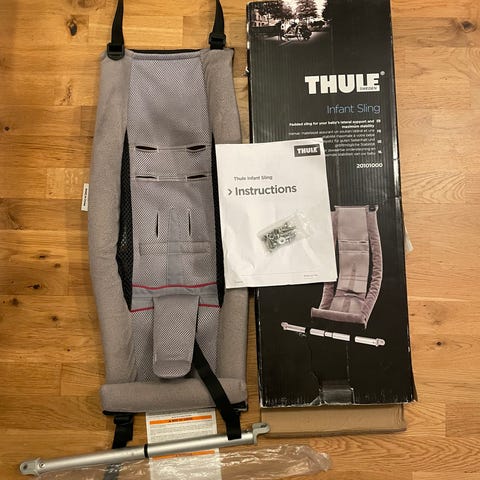 Thule Infant Sling i bra skick. Perfekt för att tryggt och bekvämt ta med din bebis i cykelvagn eller barnvagn från tidig ålder. Enkel att montera och ger bra stöd för både huvud och kropp. Använd sparsamt, inga skador eller slitage.