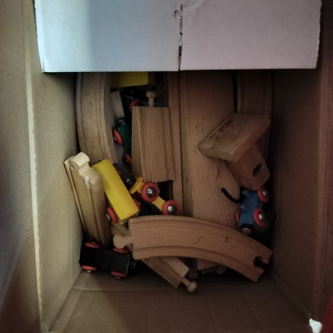 Tågbana med diverse tåg och tillbehör. Helt okej skick. Mestadels från IKEA.