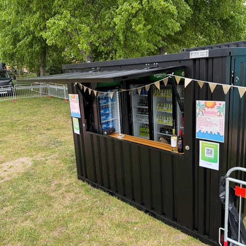 Fristående kiosk i form av en mindre träbod, målad i vitt med mörkt tak. Byggnaden har dörr framtill samt serveringslucka och fönster på sidan. Kiosken är uppställd på en mindre trätrall vid entrén. Konstruktionen lämpar sig för användning som glasskiosk, cafékiosk eller enklare försäljningsbod. Invändig planlösning och exakta mått framgår inte av bilderna och kan behöva kontrolleras på plats.