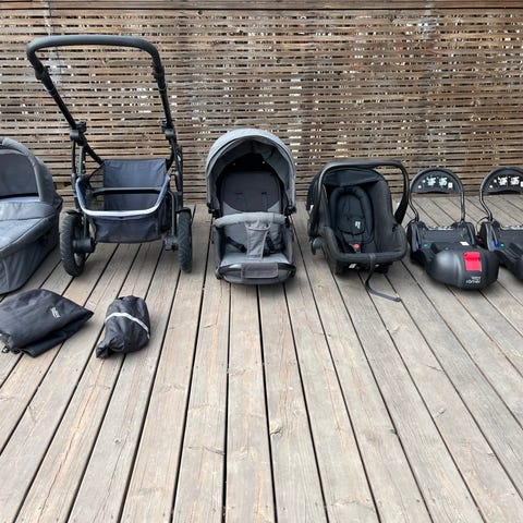 BRIO barnvagn (Sing) med tillhörande delar. Paketet inkluderar chassi med hjul, liggdel, sittdel, babyskydd samt bilbas till babyskyddet. Flera delar är i matchande mörka färger. Barnvagnen kan användas från nyfödd med liggdel och babyskydd, och senare med sittdel när barnet blir större. Babyskyddet kan fästas i bilen med den medföljande basen. Alla delar är anpassade för ett barn och är avsedda för vardaglig användning vid promenader och bilresor.