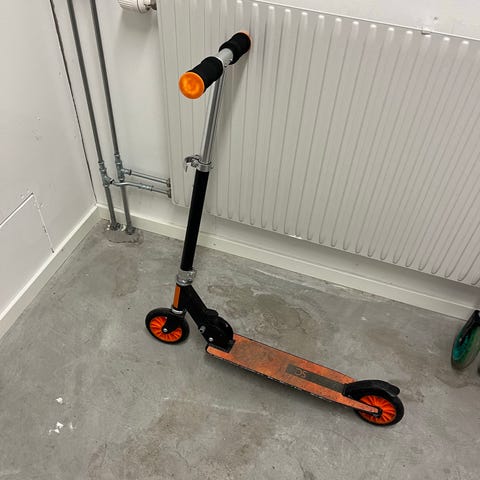Sparkcykel från Decathlon, tål upp till 100 kg. Passar för äldre barn, tonåringar eller vuxna med kortare kroppslängd. De är hopfällbara, vilket gör dem lätta att transportera och förvara.