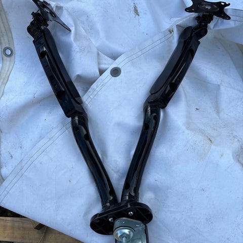 Skärmhållare för två skärmar som kan fästas direkt på skrivbordet. Inget väggfäste.
