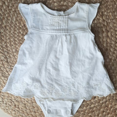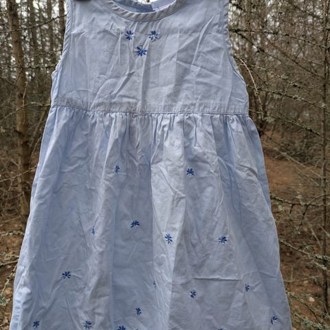 Blå klänning i tunt mjukt jeanstyg med vita broderade blommor. Knappar baktill för enkel påklädning. Mycket fint skick!
