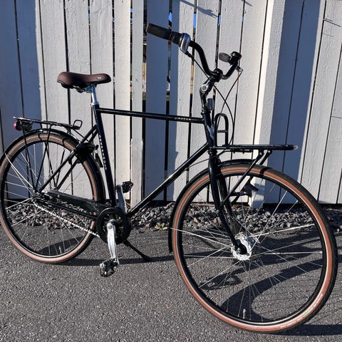 Kvalitetscykel från Skeppshult med ramstorlek 55 cm och 28" hjul. 7 växlar, navväxel. Cykeln har klassisk herrram i svart färg med dekordetaljer. Utrustad med framkorg i metall, pakethållare bak, stänkskärmar, kedjeskydd och reflexer. Styret är upprätt med handtag i brun färg och sadeln från Brooks är i läder, bred och fjädrad för mer upprätt sittställning. Lämplig som vardagscykel.
