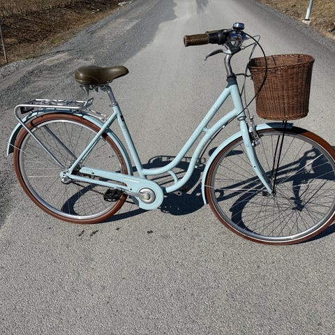 Damcykel från Decathlon, köpt ramstorlek 52 cm och 28" mycket sparsamt använd av dottern som sluade cykla till skolan hanska på en gång.