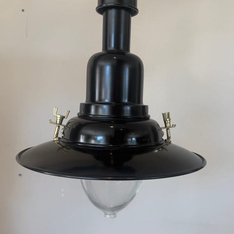 Marin eller industriell kökslampa från Ikea. Svart med mässingsfärgade beslag.