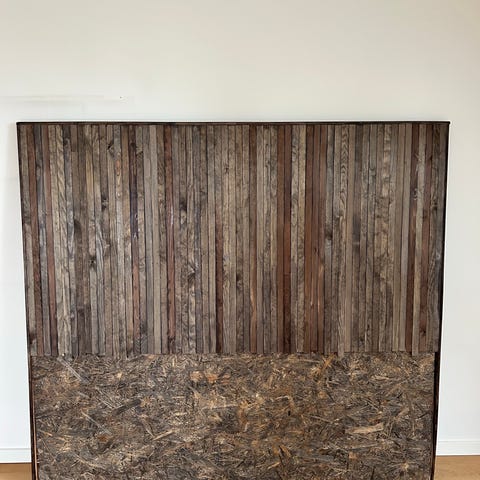 Sänggavel klädd med mörkgrå sammet och klädda knappar. Tygets slitstyrka är på 28000 Martindale.