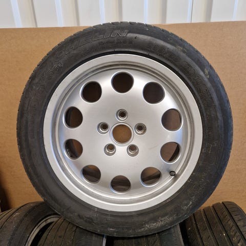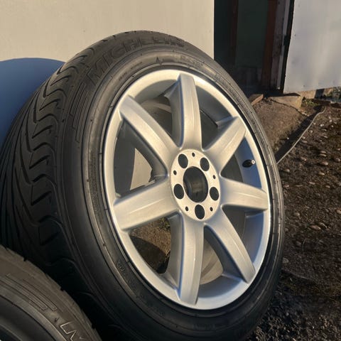 Däcken är något ojämnt slitna med mer slitage på ytterkanten, troligen på grund av hjulvinkeln. Säljs i befintligt skick.