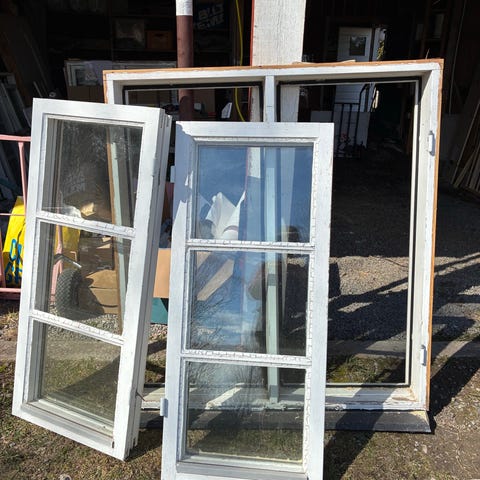 Fönster med karm i vitmålat trä. Fönstren har tre glasrutor per båge och levereras tillsammans med tillhörande karm. Passar exempelvis till bostadshus, förråd eller andra byggnader där man önskar fönster med klassiskt utseende. Exakta mått och glastyp behöver kontrolleras vid intresse.