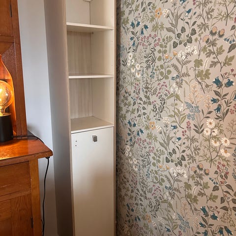 Skåpet har fyra hyllor och en utdragbar låda. Överdelen går att fälla upp och då får man tillgång till en sminkspegel och lite mer förvaringsutrymmen.