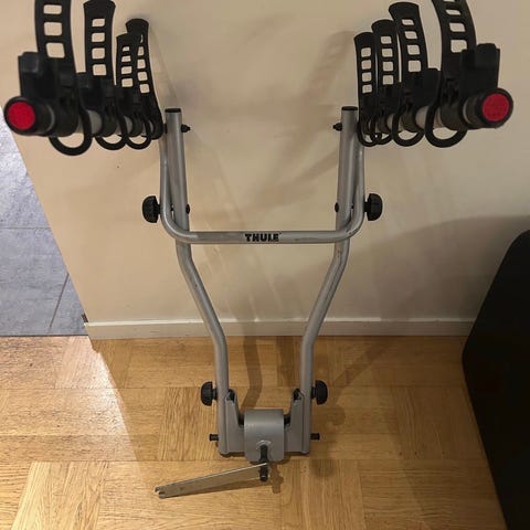 Thule cykelhållare för dragkrok i silverfärg. Hållaren monteras på bilens dragkrok och har plats för flera cyklar med individuella hållare i plast. Utrustad med röda reflexer baktill. Passar för transport och förvaring av cyklar på bil under körning. Tillverkad i metall med plastdetaljer.